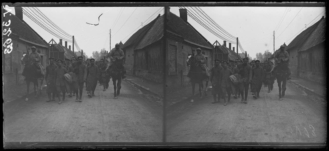 Des prisonniers allemands traversent le village de Beaulieu-les-Fontaines le 20 octobre 1918.