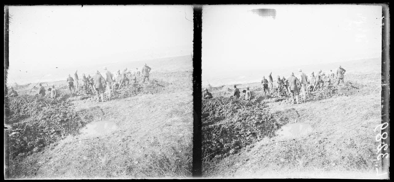 Beaumont, Meuse, soldats marocains posant du barbelés dans le ravin du Helly.