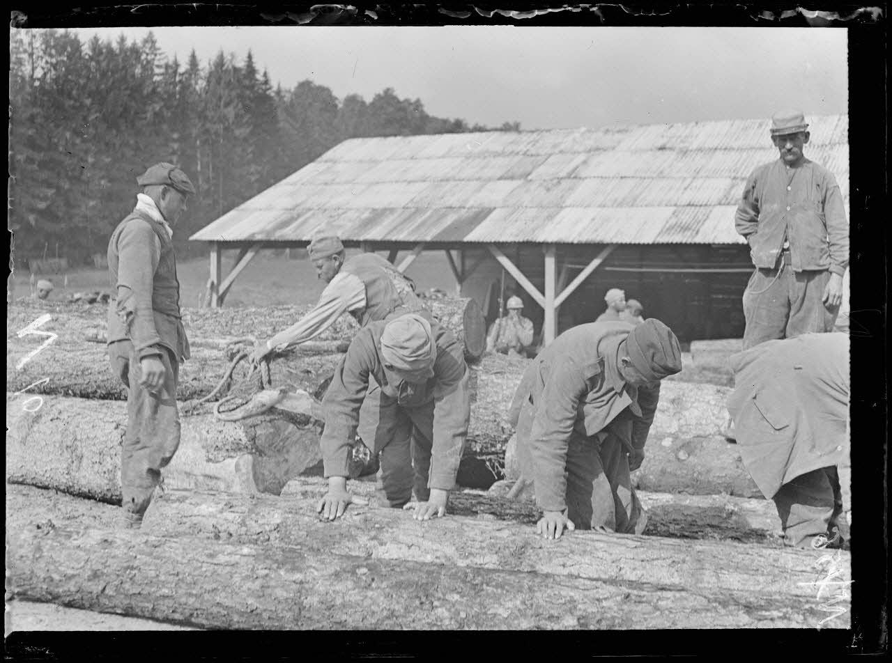 Benoite-Vaux (Meuse). Prisonniers allemands travaillant dans une scierie.