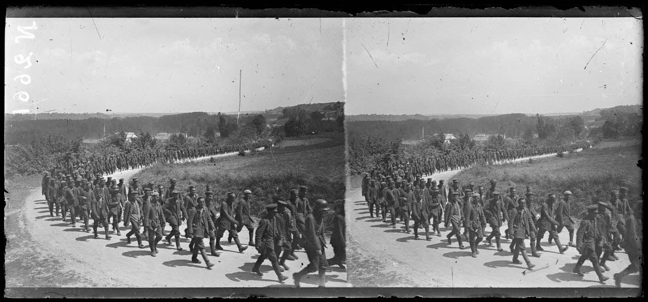 A Béthancourt, dans l'Oise, des prisonniers alsaciens et lorrains qui se sont rendus sont regroupés dans un camp. Une colonne de prisonniers allemands arrive des lignes, précédée de ses officiers.