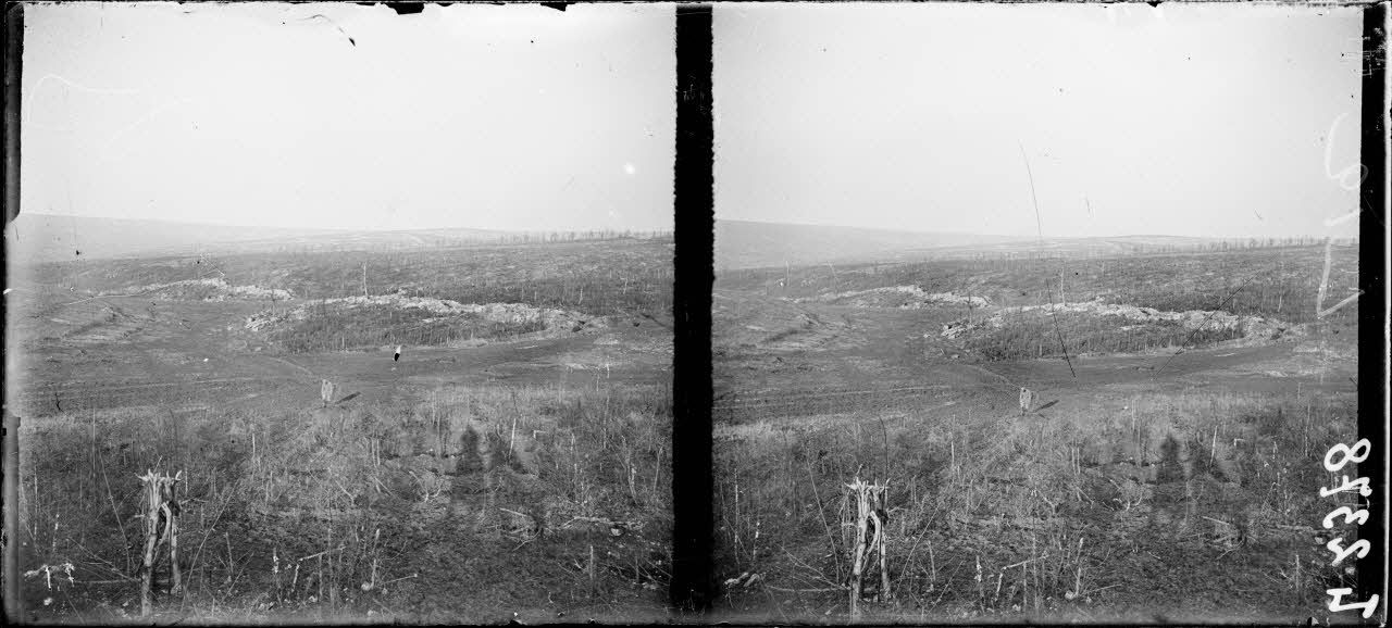 - à Bezonvaux, secteur des Chambrettes (SPA 49 L 2378, 2385 à 2392) (1). Une fortification de campagne faite de claies et un caisson d'artillerie détruit (SPA 49 L 2380/2430), le ravin de la Fontaine (paysage de forêt dévastée, une batterie détruite, SPA 49 L 2382/2431), un soldat pose devant un obus qui n'a pas explosé (SPA 49 L 2385), des soldats devant des cagnas du ravin de la Rousse (SPA 49 L 2386), un cadavre français dans une tranchée (SPA 49 L 2389), une cagna dans le bois des Caurières (au nord-ouest de Bezonvaux, SPA 49 L 2399/2432), la forêt dévastée du ravin de la Rousse (SPA 49 L 2422) ;