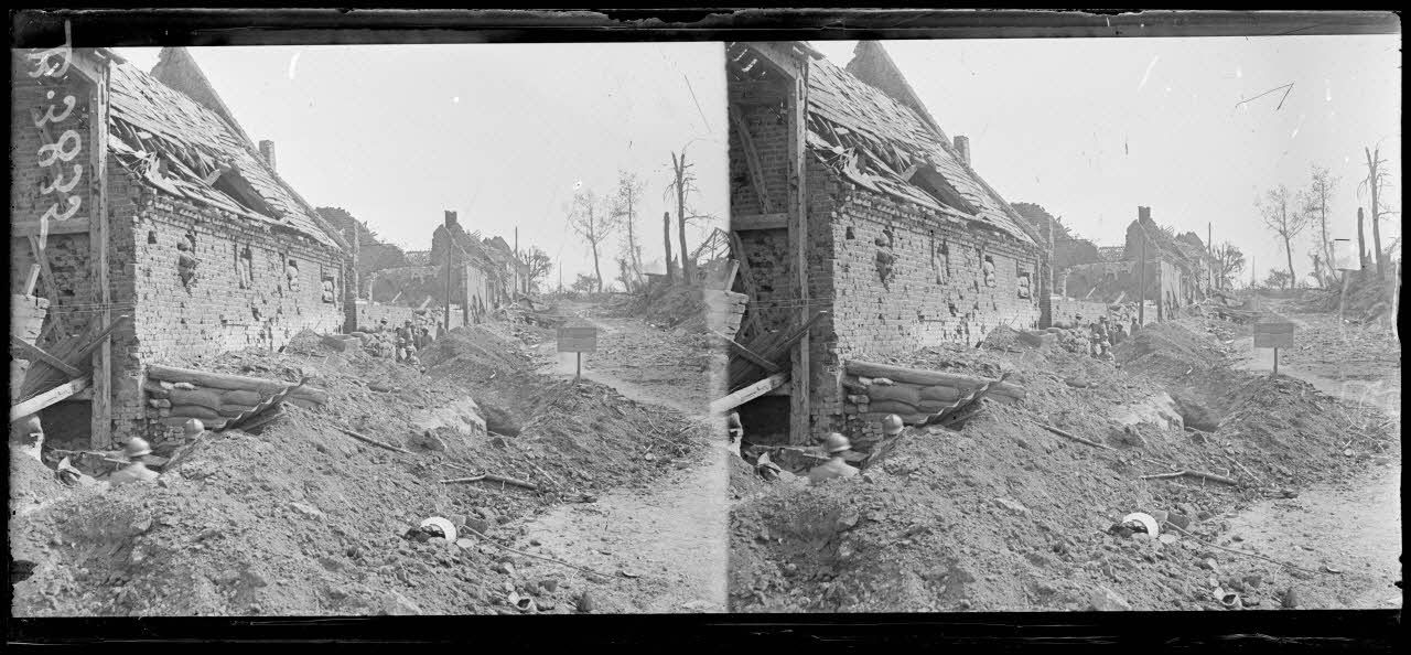 Paul Queste photographie les installations défensives, notament des tranchées situées à 30 m des Allemands, qui occupent encore des maisons et une chapelle. L'occupation a laissé des traces : ruines provoquées par l'explosion d'un obus, locomotive allemande endommagée et wagon abandonné au milieu du village, écriteau marquant une place de stationnement "Parc de la voiture de la Kommandantur", rue rebaptisée "rue de Berlin".
