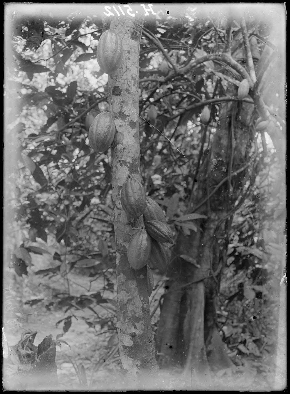 Bipindi, plantation Zenker. Fruits du cacaoyer "Criola rouge". [légende d'origine]