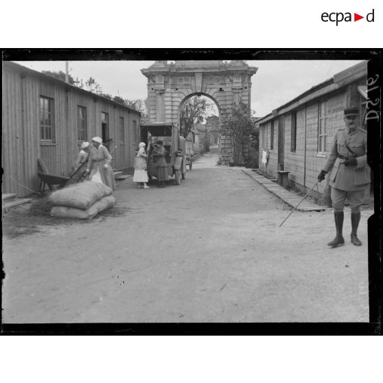 Mesdemoiselles Peyton et Taylor effectuent des travaux agricoles ; d'autres dames du Comité chargent un camion et une automobile. Elles disposent de divers baraquements, notamment d'un dépôt de meubles, d'une réserve de linge et d'un dispensaire.