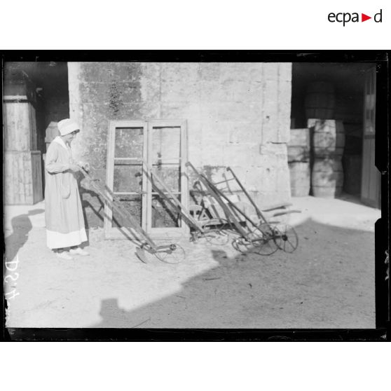 Blérancourt. Comité civil de secours américain (oeuvre de Miss Morgan). Miss Peyton tenant une petite bineuse à main.