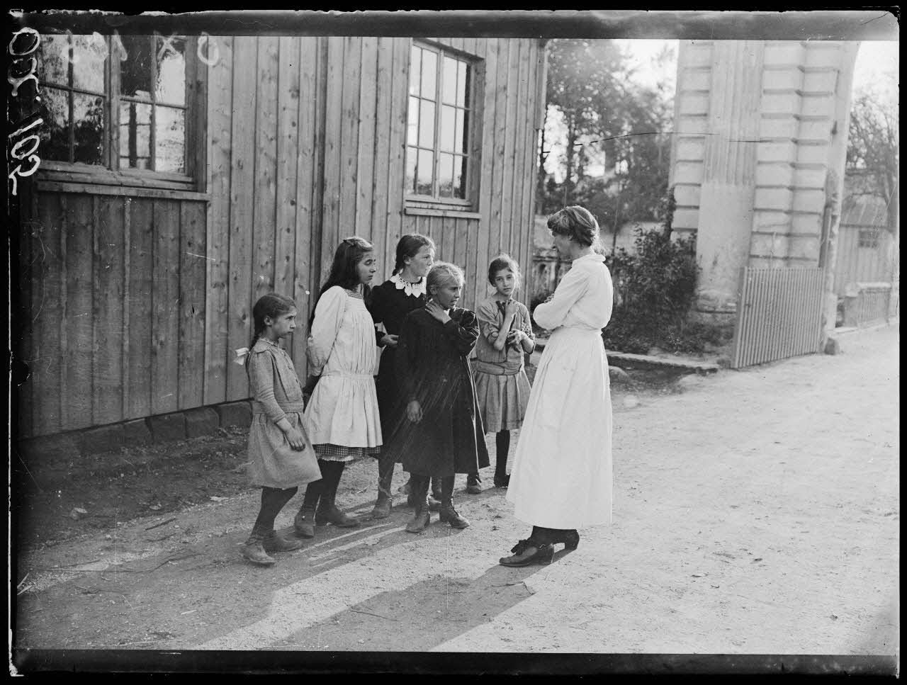 Des enfants éprouvés par l'exode viennent chercher de l'aide auprès de la Section civile du Comité américain pour les blessés français, fondée en avril 1917 par miss Anne Morgan (fille du banquier américain John Pierpont Morgan) et miss Anne Murray Dick pour venir en aide aux populations sinistrées dans les régions dévastées, en particulier dans l'Aisne, et installée à Blérancourt (Aisne) à partir de juillet 1917.