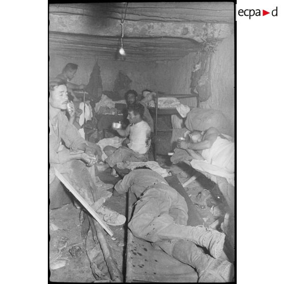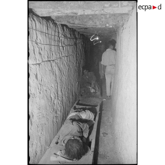 Blessés attendant de recevoir des soins médicaux dans les boyaux, près de la salle d'opération de l'antenne chirurgicale du camp retranché de Diên Biên Phu.