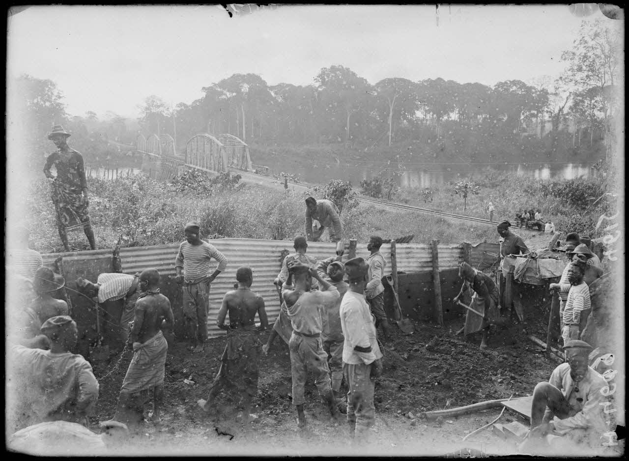 - sur le bras nord de la Sanaga, entre l'île d'Edéa et la rive droite du fleuve, il photographie les réparations du pont ferroviaire endommagé pendant le conflit ;