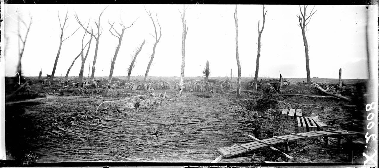 Boezinge (Belgique), passerelle sur un terrain défoncé.