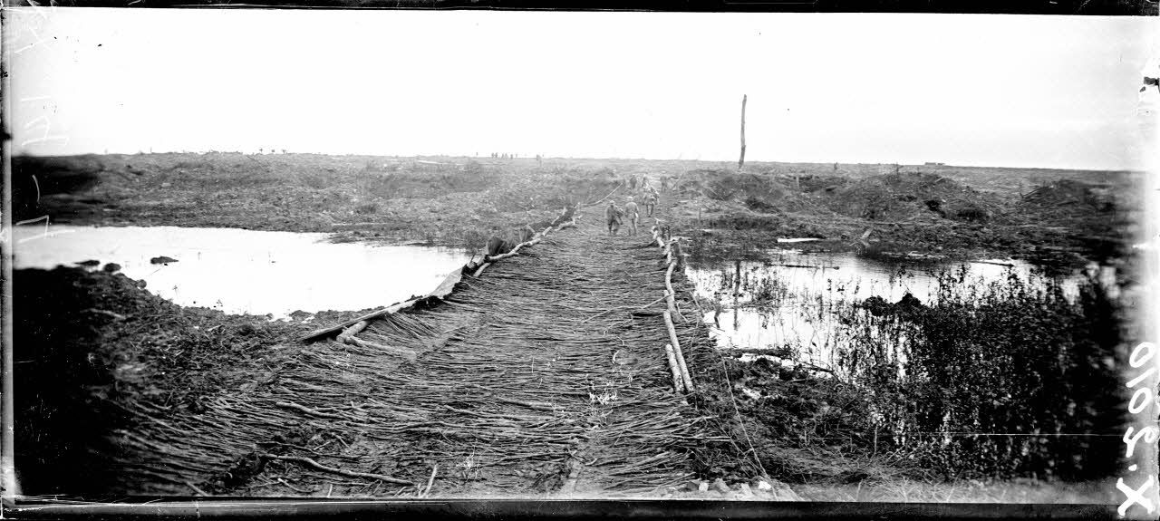 Boezinge (Belgique), passerelle sur un terrain défoncé.