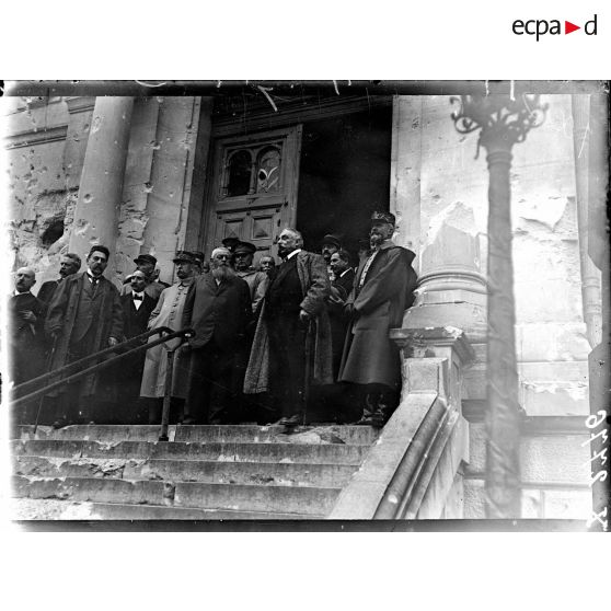 Sur le perron de l'hôtel de ville de Château-Thierry, des personnalités politiques regardent le défilé en l'honneur des soldats américains tués sur le sol français.