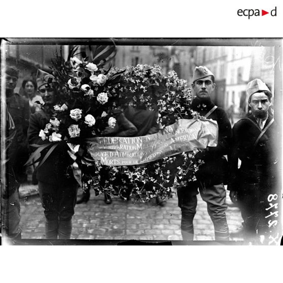 Une couronne que les sociétés de préparation militaire vont déposer sur les tombes des soldats américains au Bois Belleau.