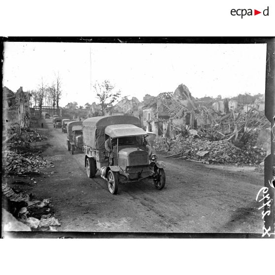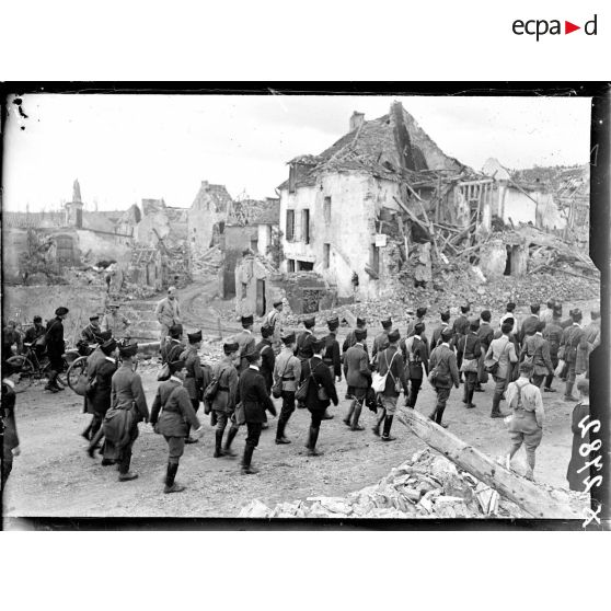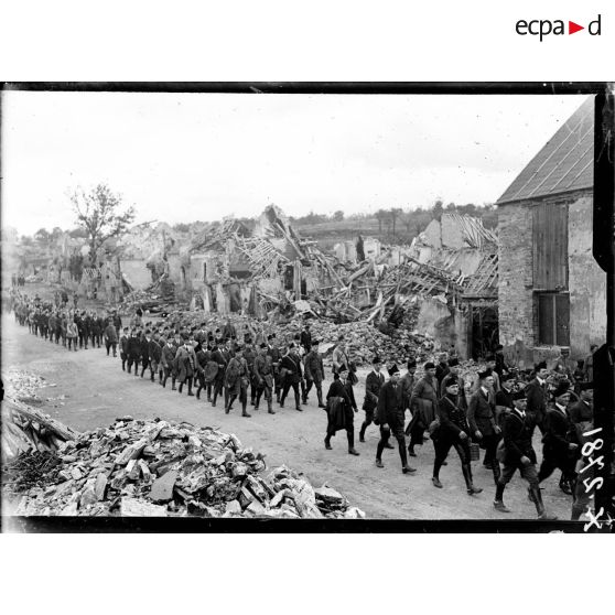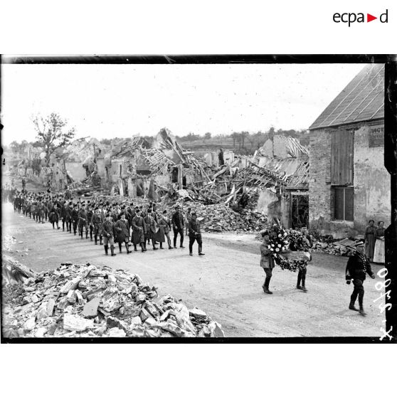 Les membres des sociétés de préparation militaire traversant le village de Vaux.