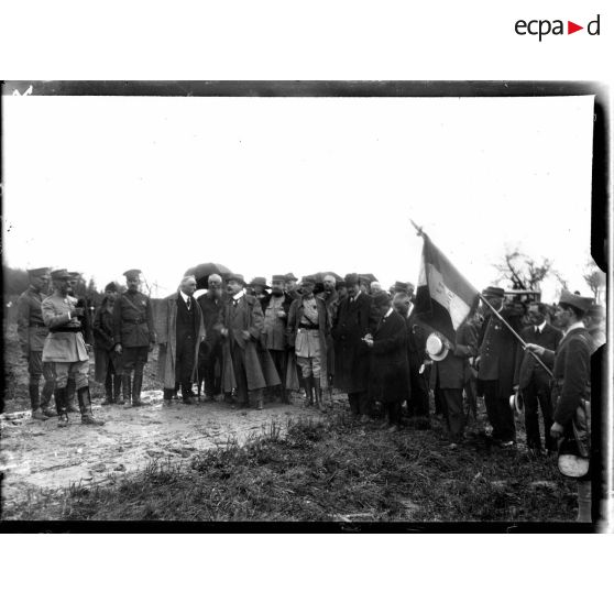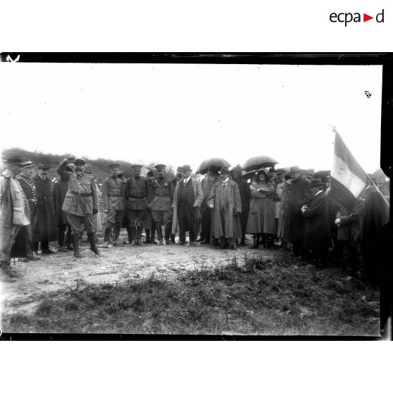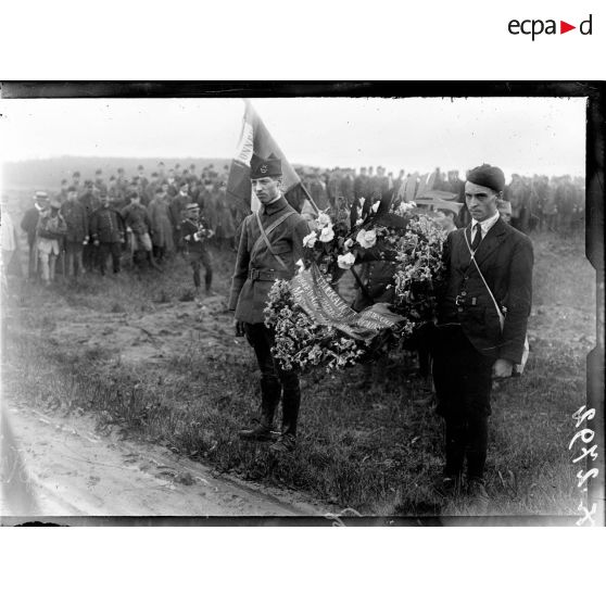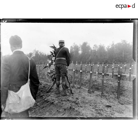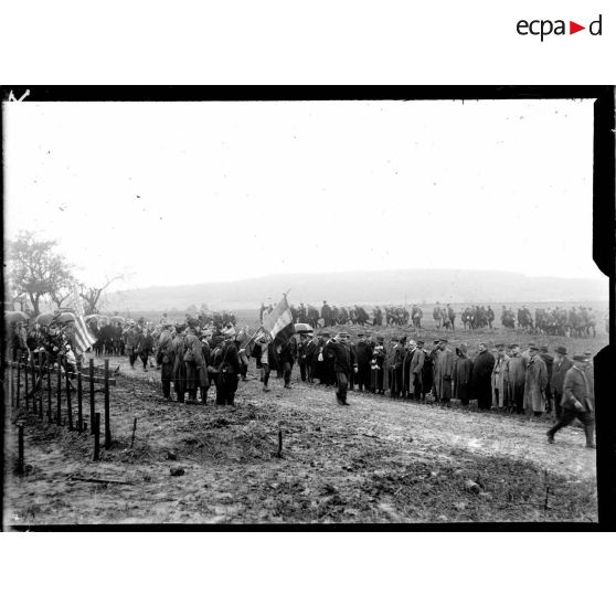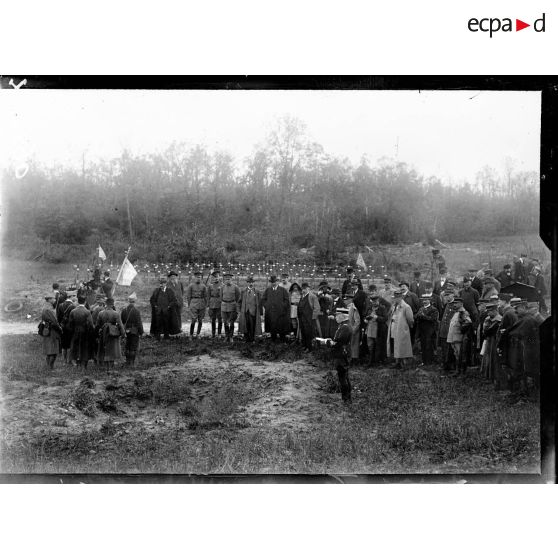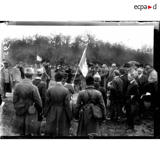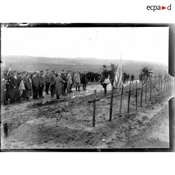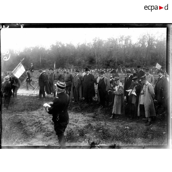 Bois Belleau (Aisne). Les sociétés de Préparation Militaire devant les tombes des soldats américains. Mr Lattès prononçant son discours. [légende d'origine]