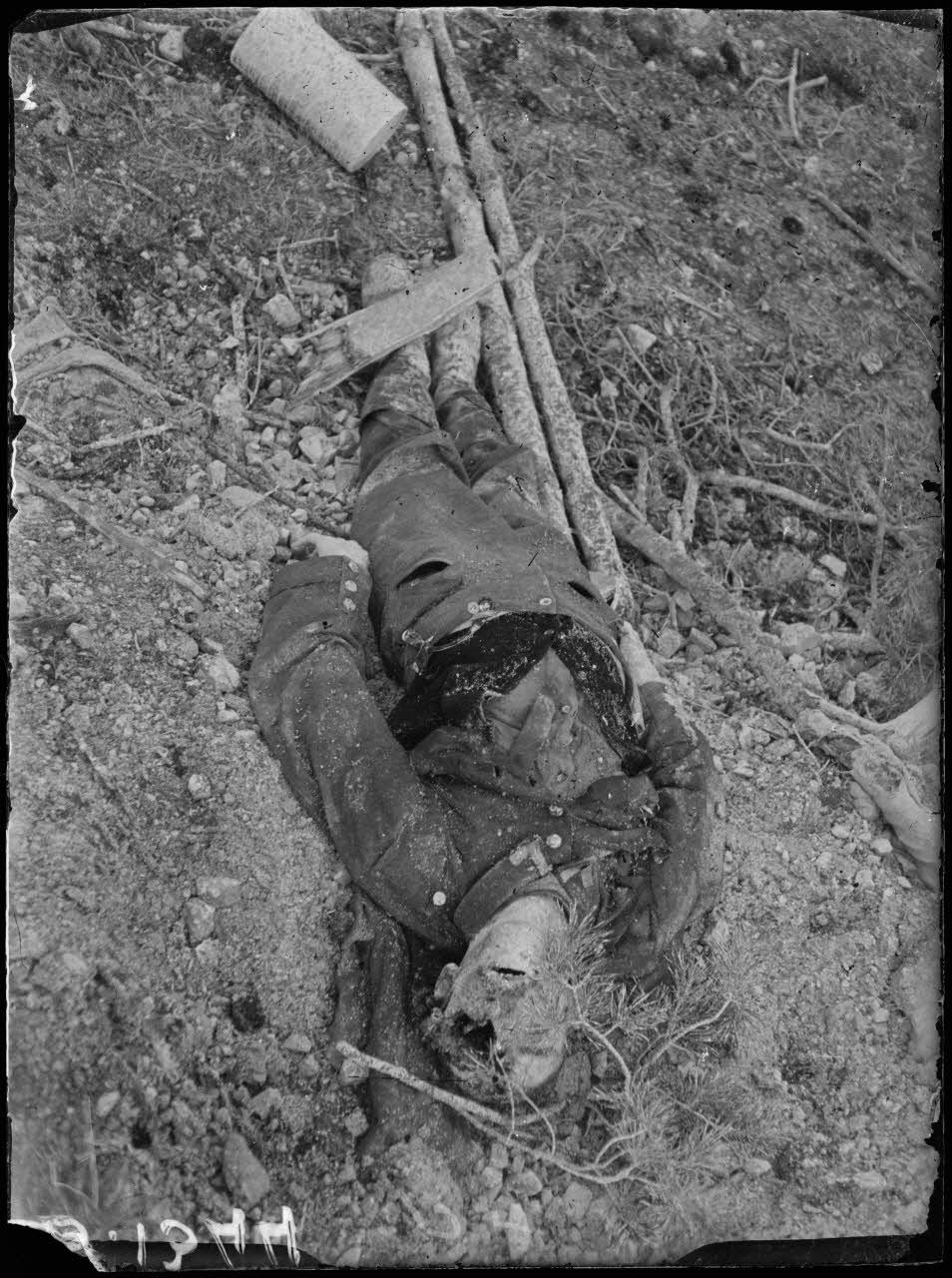 Bois Bricot. Cadavre allemand qui a eu le crâne ouvert par un obus. [légende d'origine]