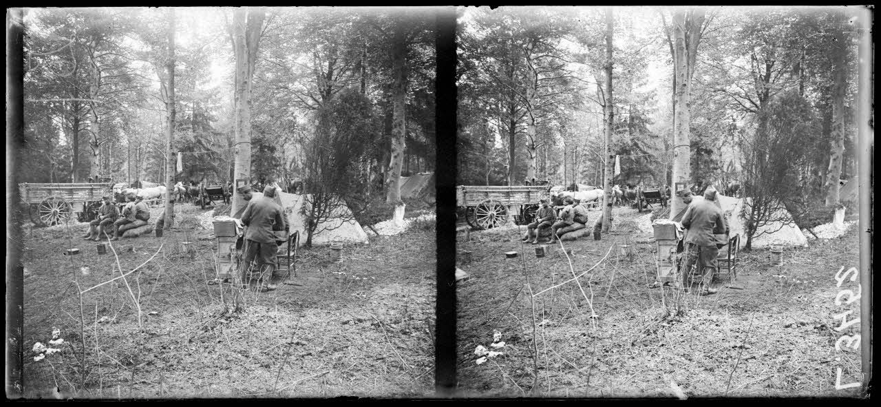 - dans le bois de Gentelles, le cantonnement d'une unité d'artillerie, le poste de commandement, les soldats (photographie de groupe), les chevaux, (SPA 72 L 3443/3452/3445/3446/3451) ;