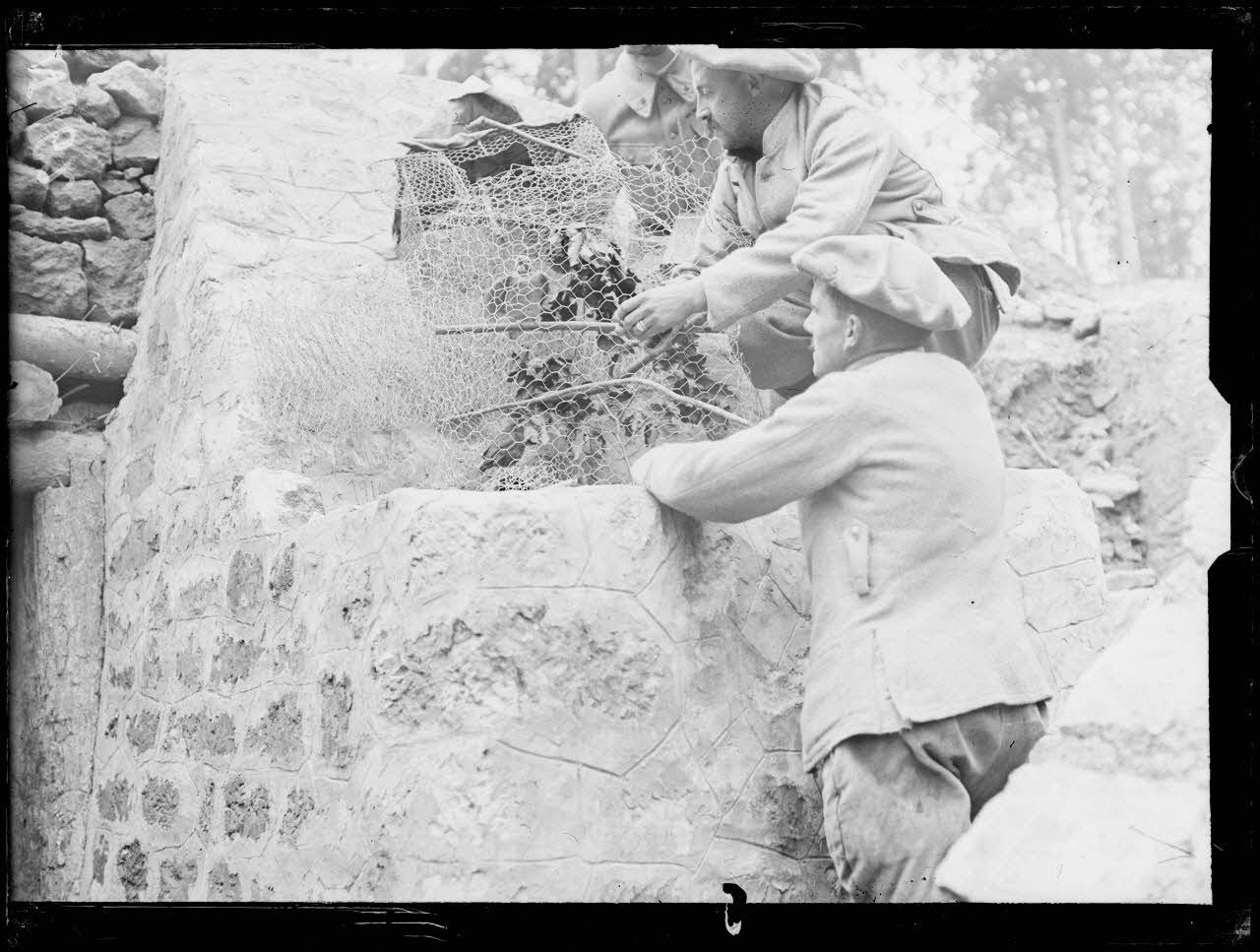 - Dans le bois de Lachalade, les cantonnements et abris de première et seconde ligne acceuillent les soldats, le café, le perruquier, le poste d'air comprimé, l'arrivée de la soupe aux tranchées, l'entrée d'une sape, un poste d'écoute installé dans un cratère d'obus, les lignes allemandes à 10 mètres, la cote 285, le PC du commandant Tissier, le cimetière du Four des Moines, l'ouvrage Garnier installé sur le secteur de la Haute Chevauchée, le PC du 82e régiment d'infanterie installé près de la crête de la Fille Morte, un cours théorique sur le tir contre avion à la mitrailleuse.