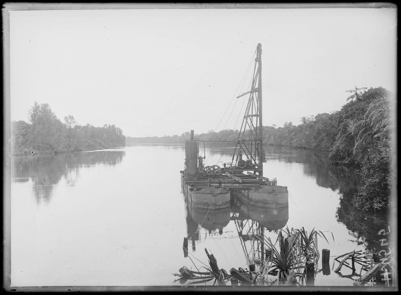 Sur le Bomono, affluent du Wouri, une sonnette à vapeur, engin hydraulique servant à enfoncer des pilotis dans le sol, stationne au milieu des eaux calmes du fleuve.
