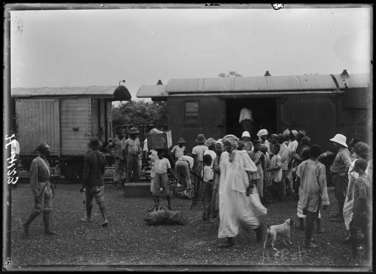 Bonabéri. La gare à l'arrivée d'un train. Sortie des voyageurs. [légende d'origine]
