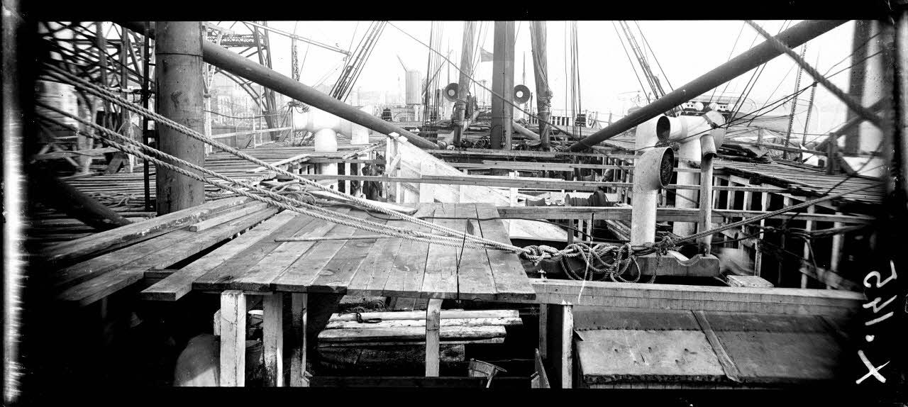 - Le déchargement de denrées (maïs, tabac, farine d'Amérique du nord) et de chevaux du Canada et d'Argentine au port de Bordeaux. Outre le déchargement des denrées et des cargos à quai, les clichés montrent le rassemblement des chevaux avant leur conduite au dépôt de remonte de Mérignac ainsi que, à Bègles, des magasins où se trouve stocké le coton hydrophile importé pour le service de santé.