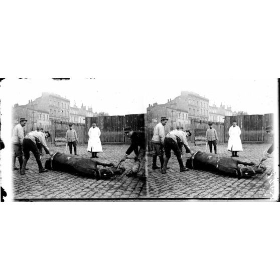 - Le déchargement de denrées (maïs, tabac, farine d'Amérique du nord) et de chevaux du Canada et d'Argentine au port de Bordeaux. Outre le déchargement des denrées et des cargos à quai, les clichés montrent le rassemblement des chevaux avant leur conduite au dépôt de remonte de Mérignac ainsi que, à Bègles, des magasins où se trouve stocké le coton hydrophile importé pour le service de santé.
