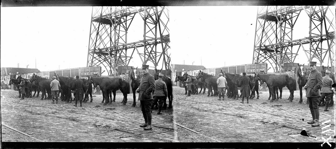 - Le déchargement de denrées (maïs, tabac, farine d'Amérique du nord) et de chevaux du Canada et d'Argentine au port de Bordeaux. Outre le déchargement des denrées et des cargos à quai, les clichés montrent le rassemblement des chevaux avant leur conduite au dépôt de remonte de Mérignac ainsi que, à Bègles, des magasins où se trouve stocké le coton hydrophile importé pour le service de santé.