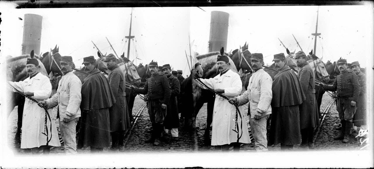 - Le déchargement de denrées (maïs, tabac, farine d'Amérique du nord) et de chevaux du Canada et d'Argentine au port de Bordeaux. Outre le déchargement des denrées et des cargos à quai, les clichés montrent le rassemblement des chevaux avant leur conduite au dépôt de remonte de Mérignac ainsi que, à Bègles, des magasins où se trouve stocké le coton hydrophile importé pour le service de santé.