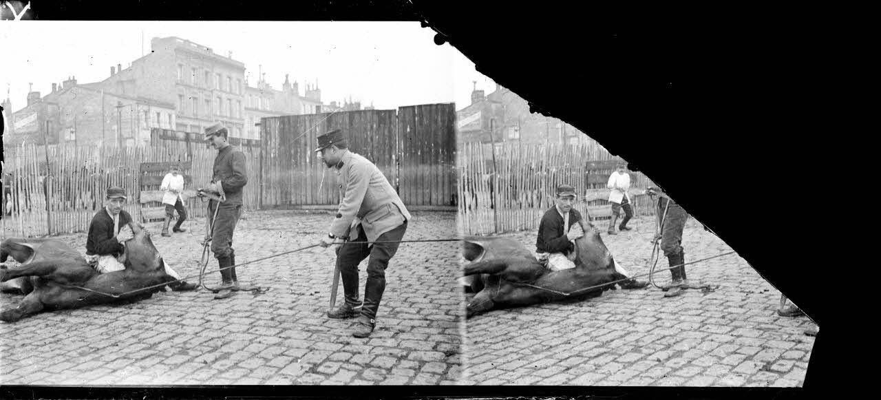 - Le déchargement de denrées (maïs, tabac, farine d'Amérique du nord) et de chevaux du Canada et d'Argentine au port de Bordeaux. Outre le déchargement des denrées et des cargos à quai, les clichés montrent le rassemblement des chevaux avant leur conduite au dépôt de remonte de Mérignac ainsi que, à Bègles, des magasins où se trouve stocké le coton hydrophile importé pour le service de santé.