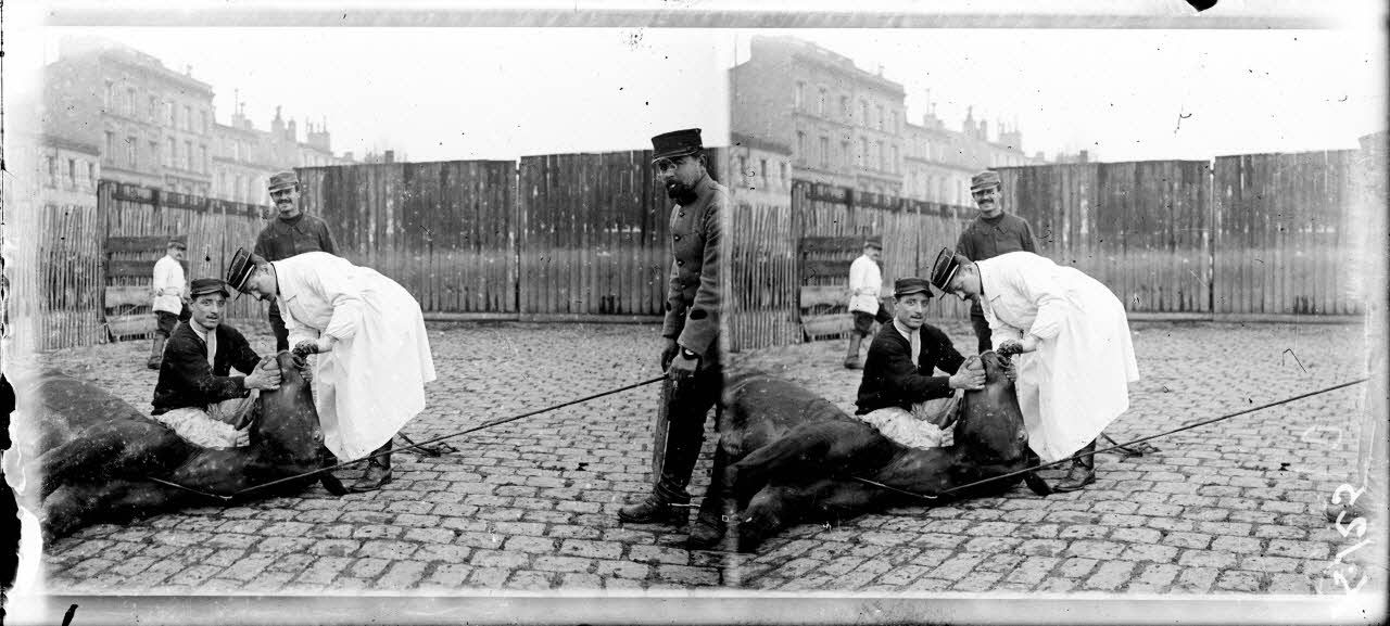 - Le déchargement de denrées (maïs, tabac, farine d'Amérique du nord) et de chevaux du Canada et d'Argentine au port de Bordeaux. Outre le déchargement des denrées et des cargos à quai, les clichés montrent le rassemblement des chevaux avant leur conduite au dépôt de remonte de Mérignac ainsi que, à Bègles, des magasins où se trouve stocké le coton hydrophile importé pour le service de santé.
