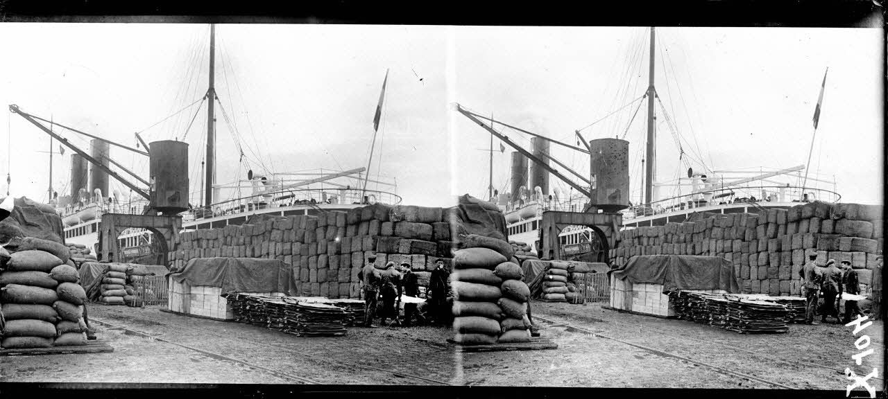 - Le déchargement de denrées (maïs, tabac, farine d'Amérique du nord) et de chevaux du Canada et d'Argentine au port de Bordeaux. Outre le déchargement des denrées et des cargos à quai, les clichés montrent le rassemblement des chevaux avant leur conduite au dépôt de remonte de Mérignac ainsi que, à Bègles, des magasins où se trouve stocké le coton hydrophile importé pour le service de santé.
