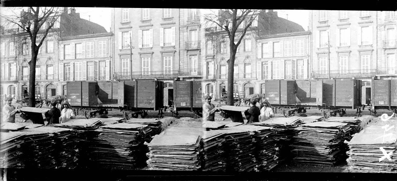 - Le déchargement de denrées (maïs, tabac, farine d'Amérique du nord) et de chevaux du Canada et d'Argentine au port de Bordeaux. Outre le déchargement des denrées et des cargos à quai, les clichés montrent le rassemblement des chevaux avant leur conduite au dépôt de remonte de Mérignac ainsi que, à Bègles, des magasins où se trouve stocké le coton hydrophile importé pour le service de santé.