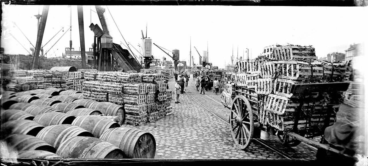 Bordeaux (Gironde). Le déchargement de caisses de biscuits et de sucre.