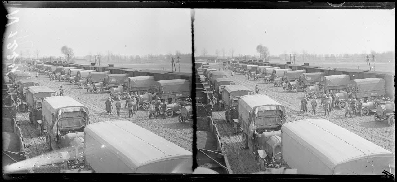 Bouy (Marne). Parc à munitions. Déchargement de camions chargés d'obus (4-4-17).