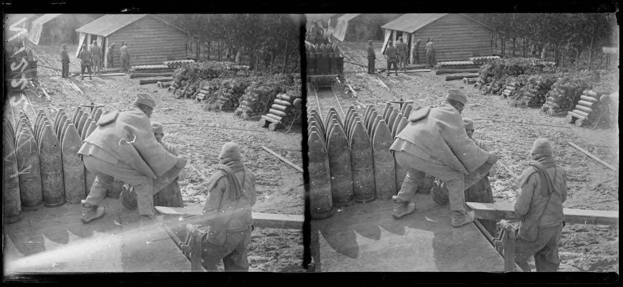 Bouy (Marne). Parc à munitions. Déchargement d'un wagon d'obus de 220 (4-4-17). [légende d'origine]