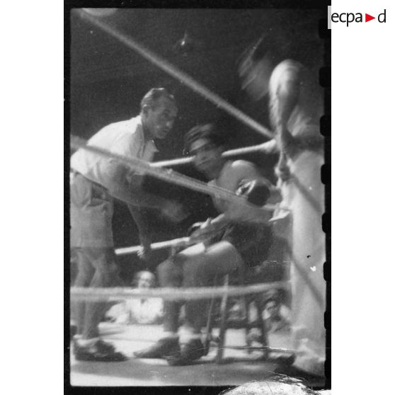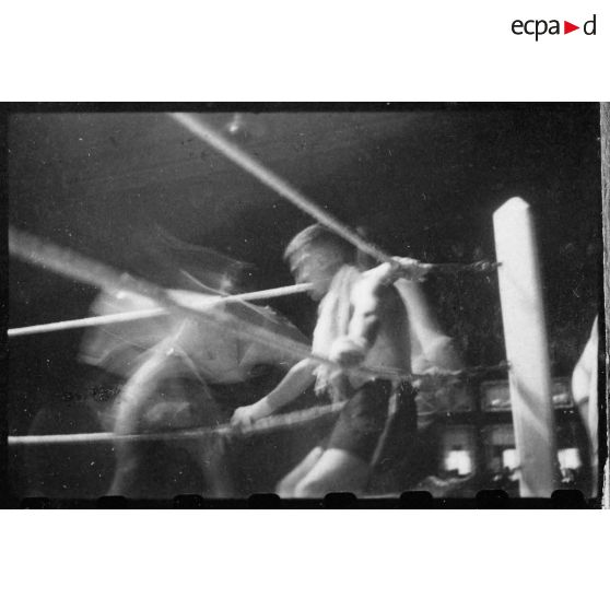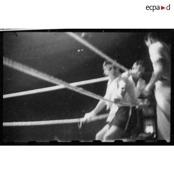 Boxeurs au coin du ring lors d'un gala de boxe à Saigon.