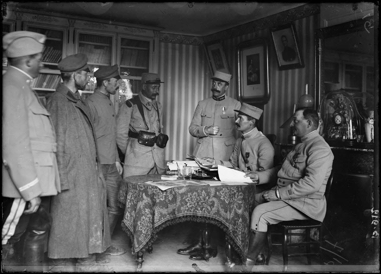 Bras-sur-Meuse. Interrogatoire de deux soldats russes qui se sont sauvés des lignes allemandes et arrivés dans nos lignes après 8 jours de voyage et avoir traversé la Meuse à la nage. [légende d'origine]