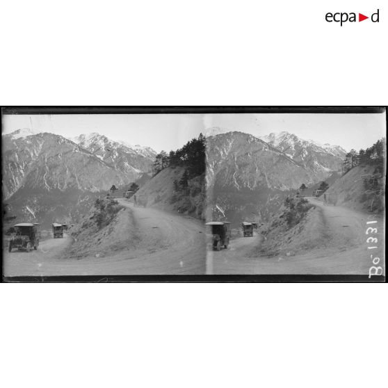 Col du Montgenèvre. Voiturettes de la 10e armée allant en Italie.