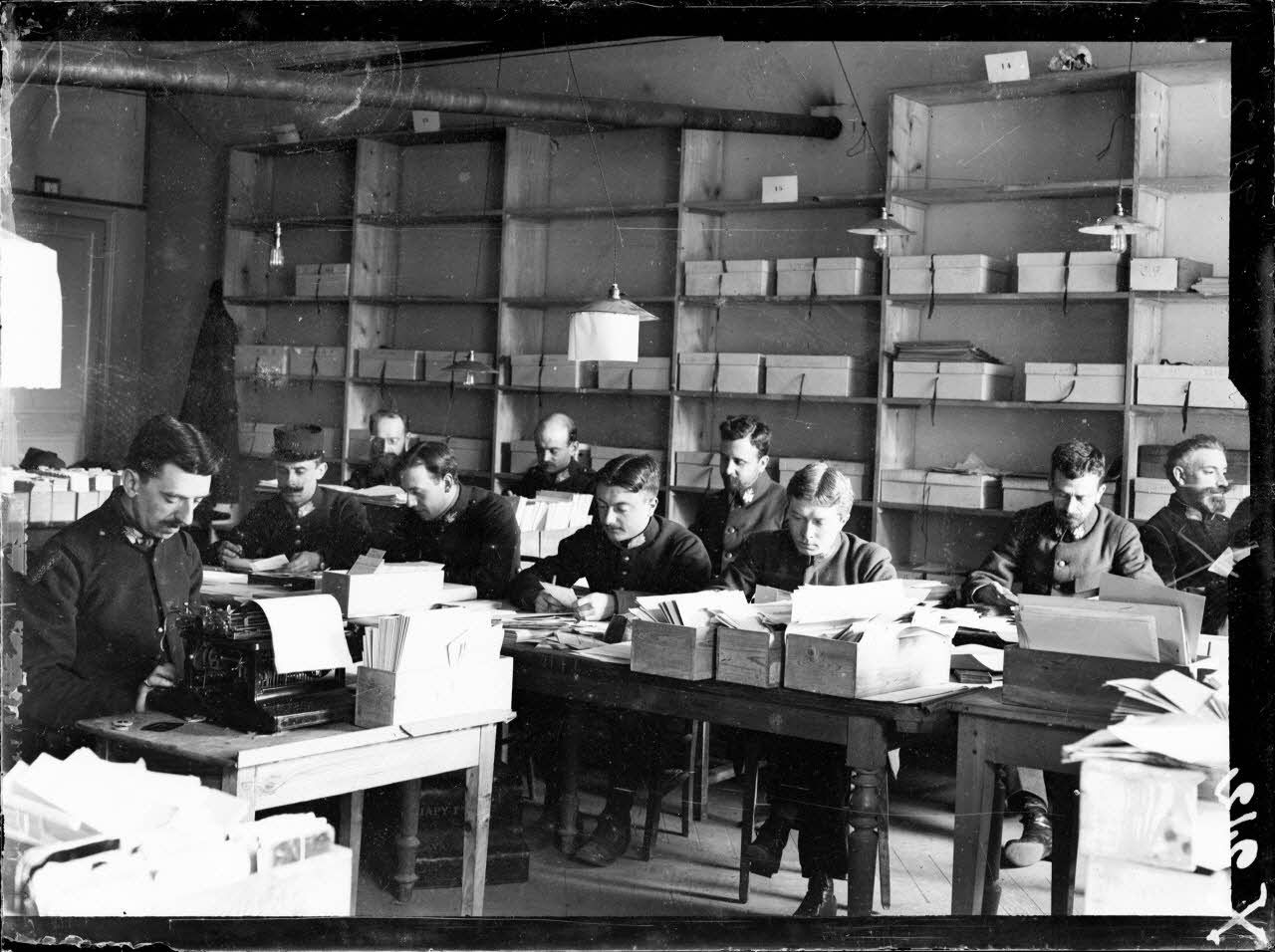 Bureau de renseignements aux familles. Ecole supérieure de guerre. Service des prisonniers de guerre. Salle de correspondance. [légende d'origine]