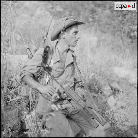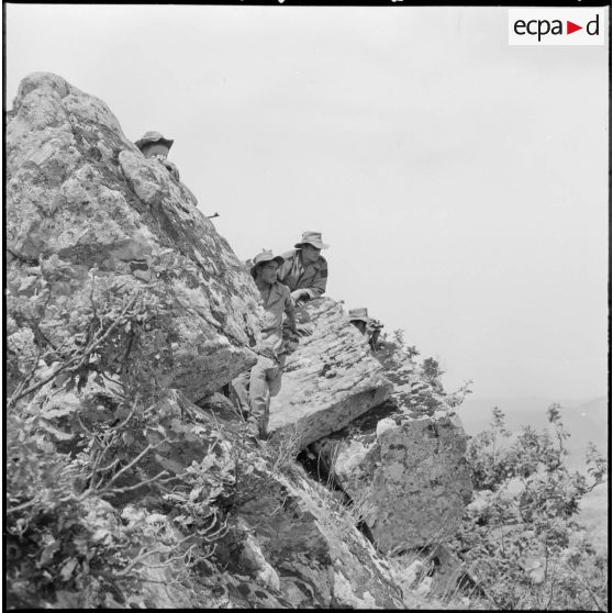 Observation du terrain sur une crête élevée par les servants de la mitrailleuse : un accrochage vient de se produire à 2 km, dans les forêts de l'Akfedou.
