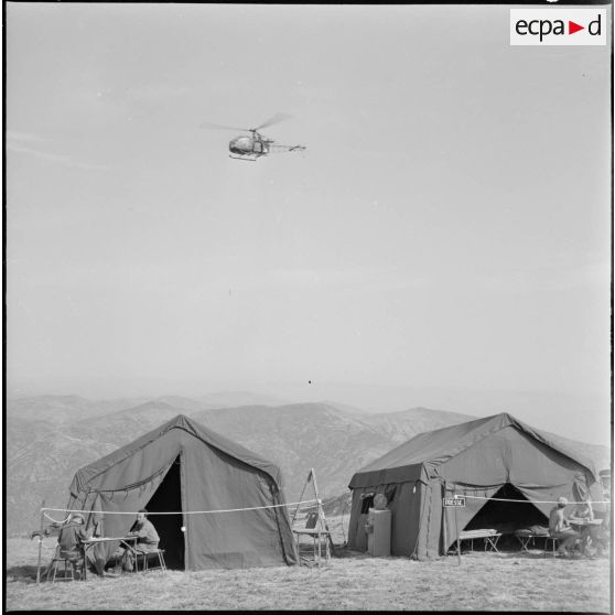 Le camp de presse au poste de commandement (PC) Artois, survolé par un hélicoptère.