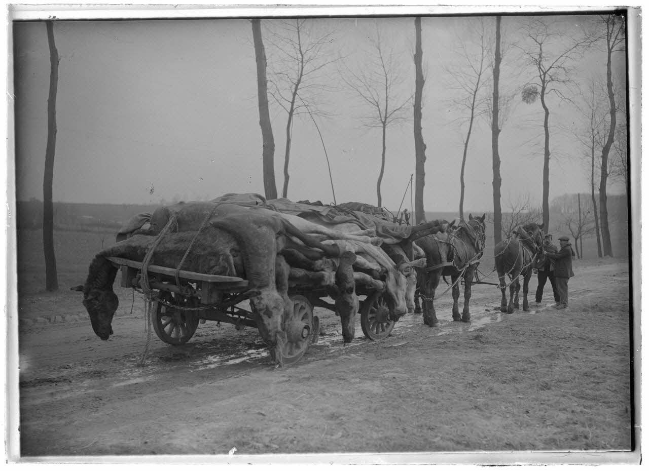 [Cadavres de chevaux entreposés sur une charette.]