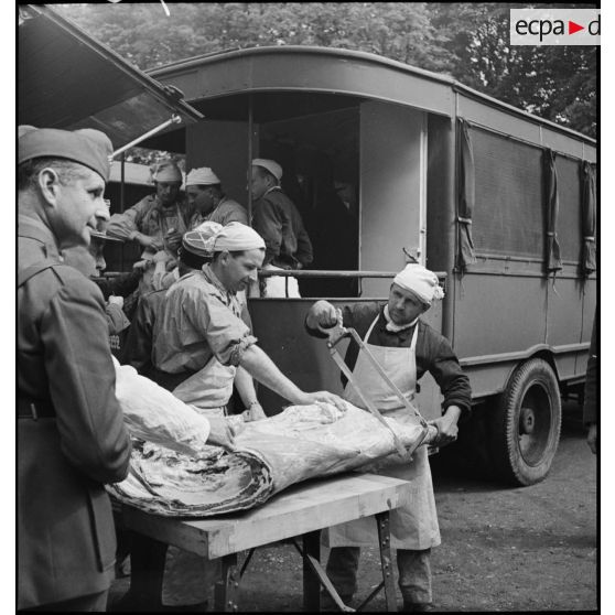 Soldats découpant une importante pièce de viande.