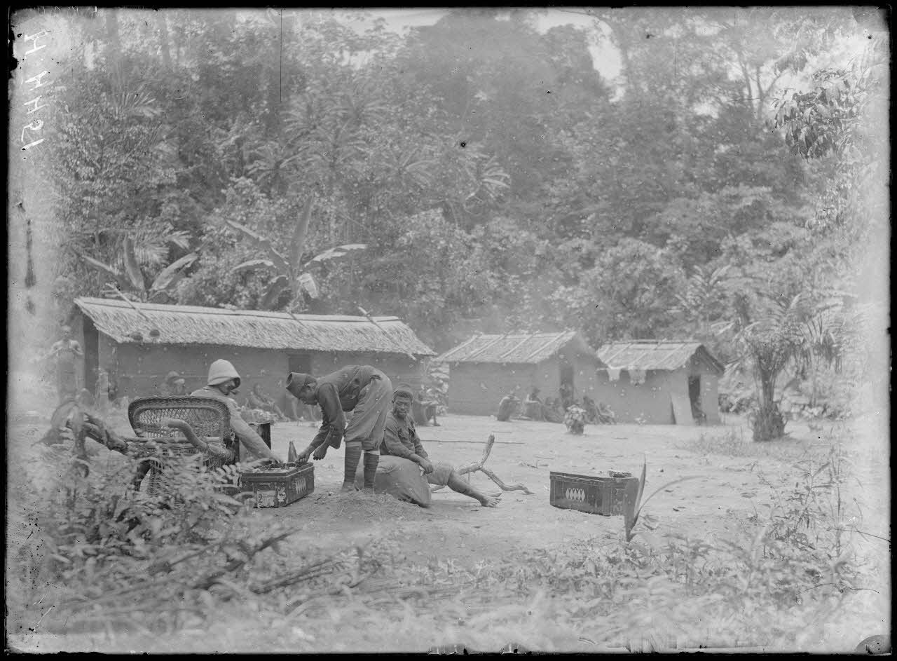 La mission photographique fait halte dans un village. Un de ses membres (militaire accompagnateur ou peut-être Gadmer lui-même) prend une collation, assis sur sa chaise à porteur, un fauteuil en osier. Deux tirailleurs l'accompagnent.