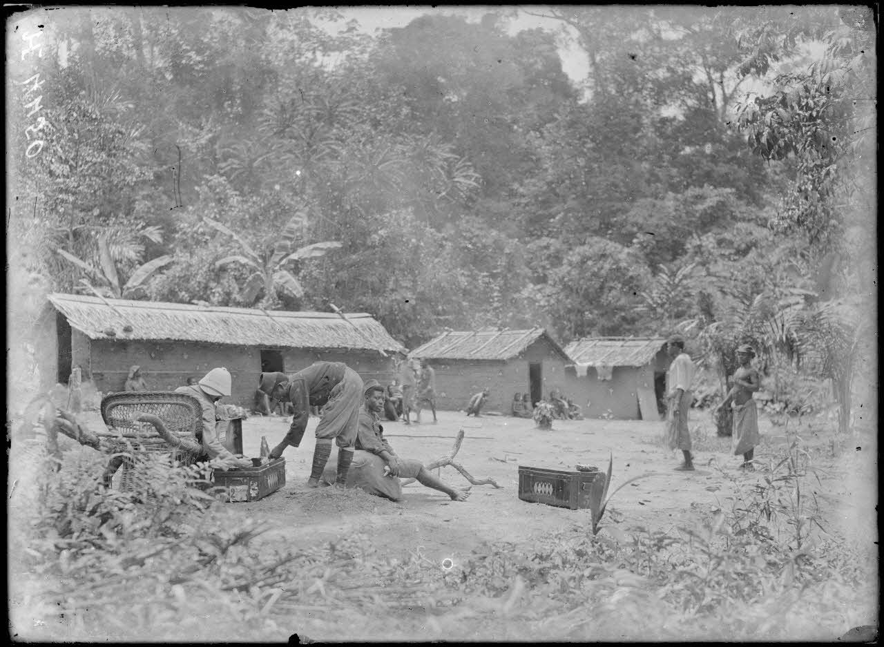 La mission photographique fait halte dans un village. Un de ses membres (militaire accompagnateur ou peut-être Gadmer lui-même) prend une collation, assis sur sa chaise à porteur, un fauteuil en osier. Deux tirailleurs l'accompagnent.