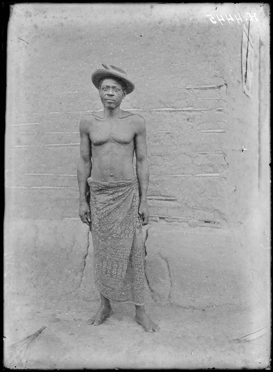 Portrait en pied d'un homme âgé de l'ethnie Bakoko, portant un chapeau.