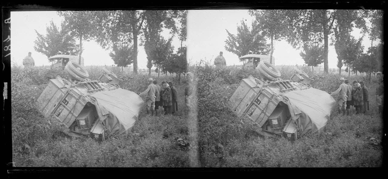 Camion chargé d’obus renversé par un accident sur le bord de la route. [légende d’origine]
