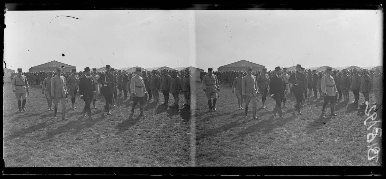 Camp d'Avord. Cérémonie en l'honneur du capitaine aviateur Guynemer. Arrivée de monsieur Dumesnil, sous-secrétaire d'Etat à l'aviation et des généraux Meunier et Muteaux et du colonel Girod.Le cortège passe devant les élèves pilotes. [légende d'origine]