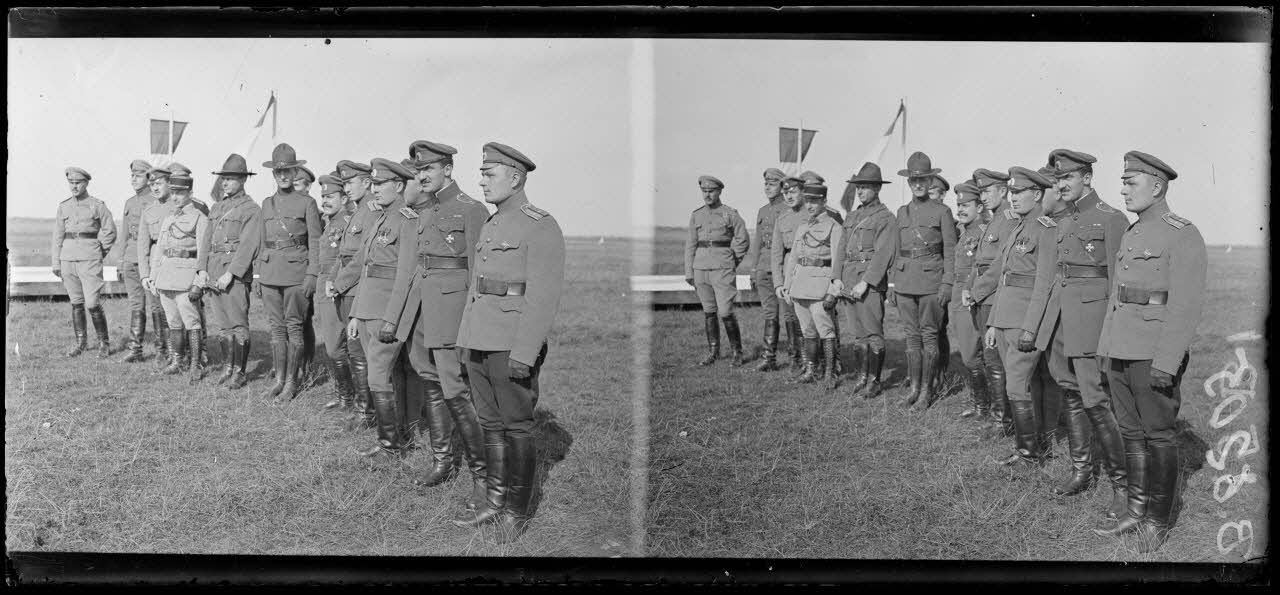 Camp d'Avord. Cérémonie en l'honneur du capitaine aviateur Guynemer. Groupe de pilotes alliés. [légende d'origine]