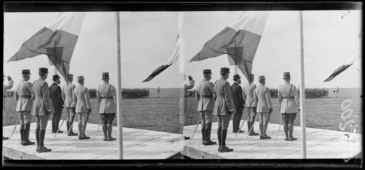 Camp d'Avord. Cérémonie en l'honneur du capitaine aviateur Guynemer. Les personnages officiels pendant le défilé des troupes. [légende d'origine]