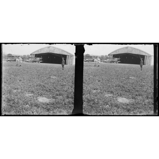 Vues du château de Bonneuil où sont installées les escadrilles N 79 et N 153 et plusieurs vues d'avions (Spad, Caudron), sur des terrains d'aviation.